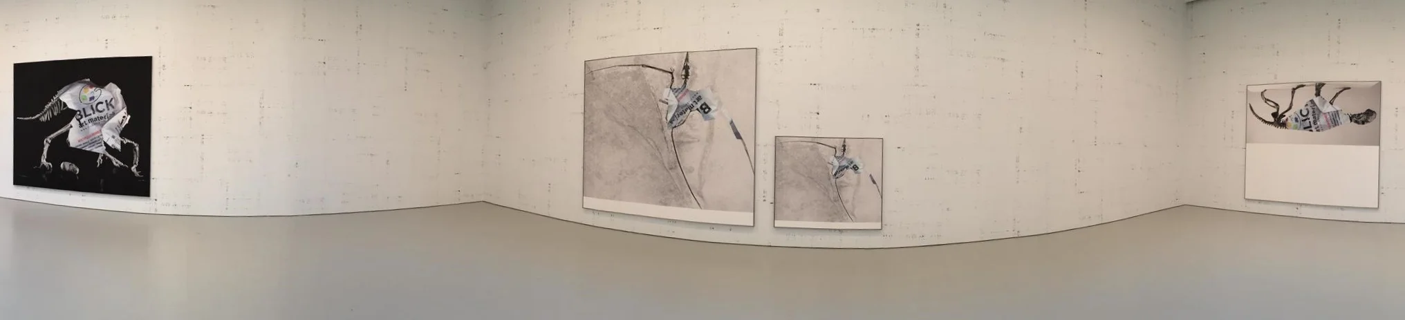 In his sixth exhibition at David Zwirner Gallery, Michael Riedel continues a project that he has pursued for the past 15 years: a system in which he recycles existing images to exploit the seemingly endless visual possibilities. For this exhibition, Riedel selected text from a website selling art supplies, transposing the meaning of the text to create large posters of layered text throughout the gallery. In addition, images of skeletons covered in art supply stickers are mounted on aluminum, interrupting the posters. Taken as a whole, Riedel’s engulfing installation demonstrates the myriad possibilities of the world he encounters each day, experienced both digitally and physically.