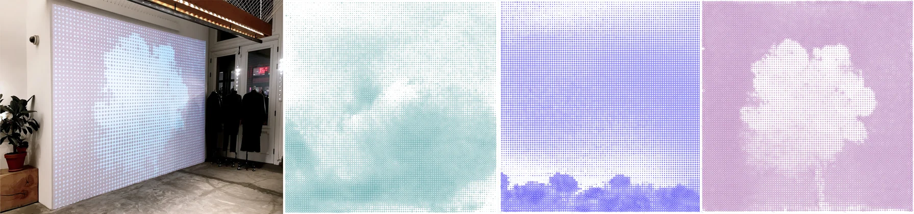 Mark, an artist known for her color saturated monotypes, delivers an enticing work that offers thoughtful pauses and moments of discovery. AGENCY reinterprets the artist’s work by means of looping digital animation records, a custom scripted image sampling process, which progressively scans Mark’s paintings, translating values in the image into a series of geometric fields. Starting with a 3×3 grid, each iterative scan increases in density, producing precisely stippled pointillist grids which progressively approach the resolution and depth of the original artwork. As the scans approach full resolution, the original artwork is briefly exposed, before dissolving again into the 3×3 grid. The technical vision of the digital processing paradoxically gives a new life to the subjects it scans – trees and clouds seem to shake, float, and vibrate, newly animated by their supposedly objective observer.